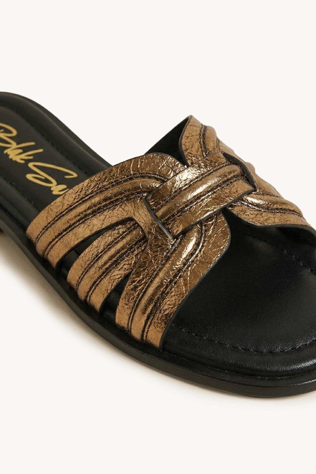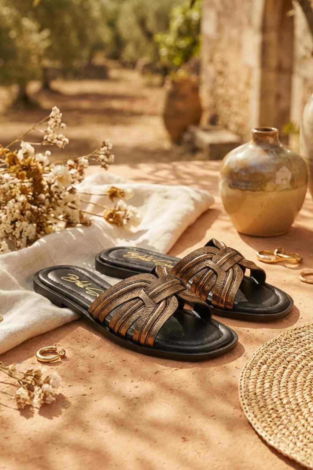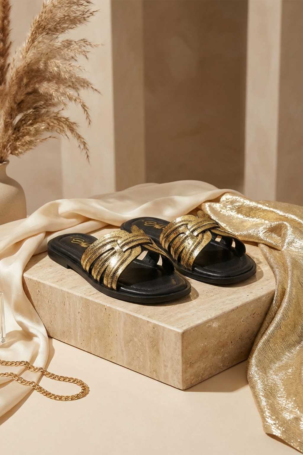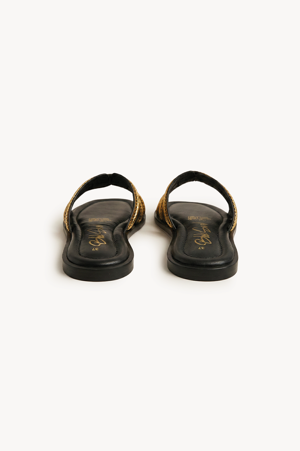 Crafted in the spirit of Italian artistry, Auréa Noir is a celebration of texture, contrast, and refined femininity. The luminous metallic gold leather is meticulously intrecciato by hand, creating a sculptural play of light against the deep noir base.