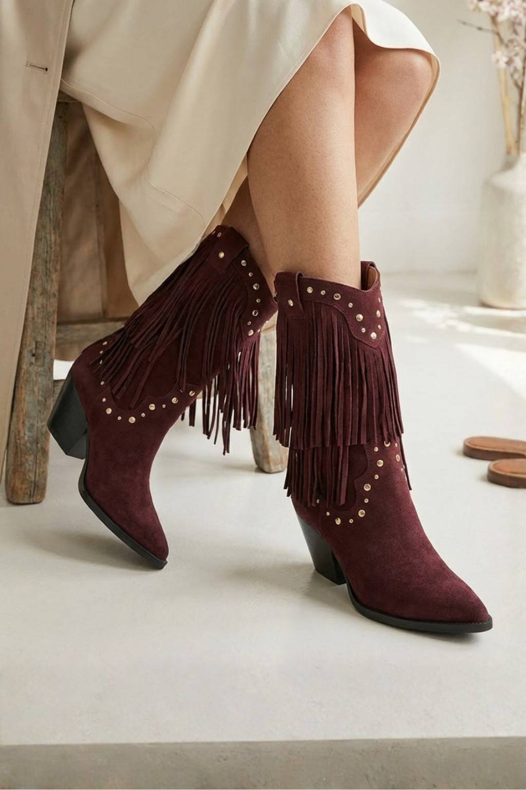 Perfect for pairing with jeans, skirts, or dresses, these fringe boots add instant edge to any wardrobe.