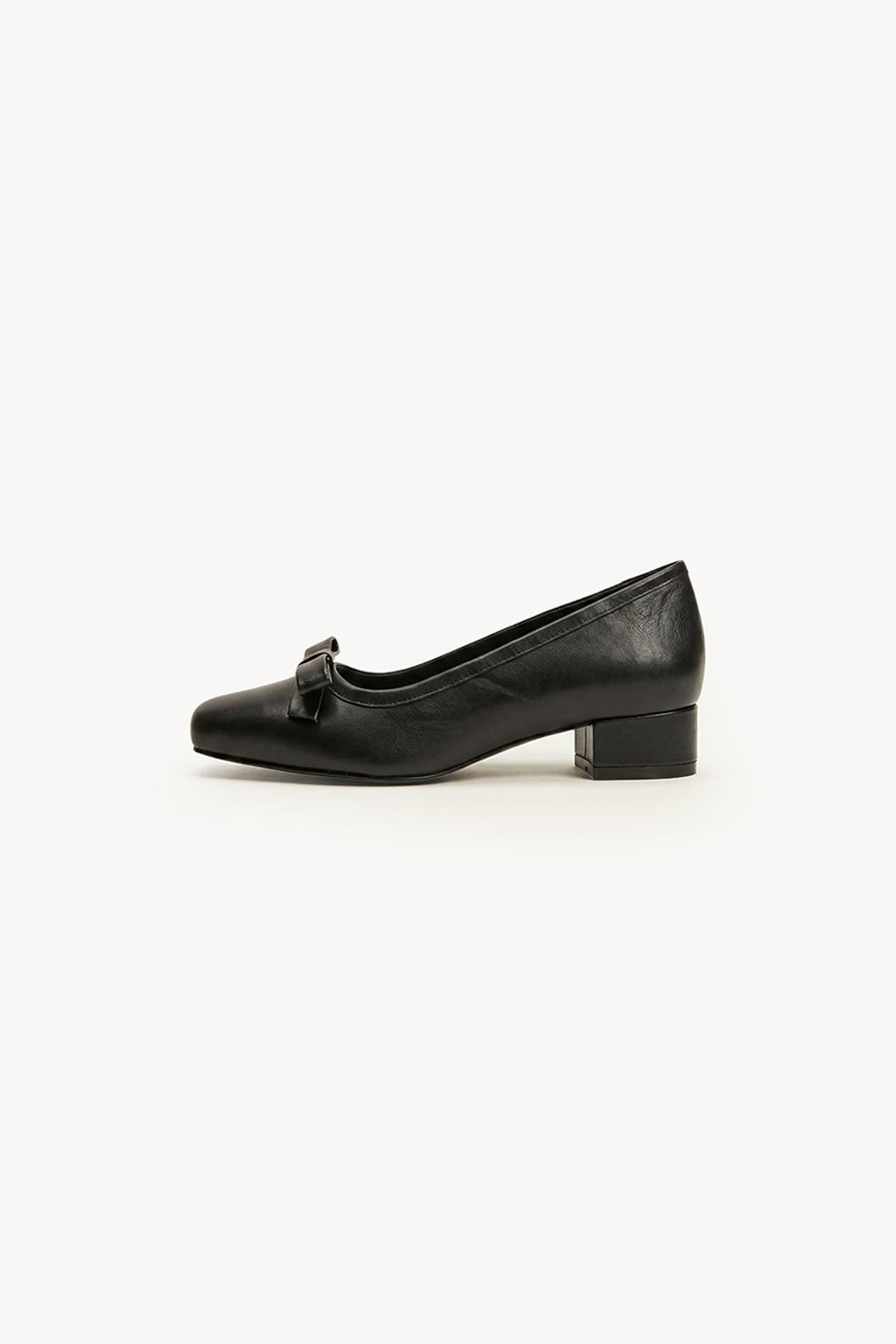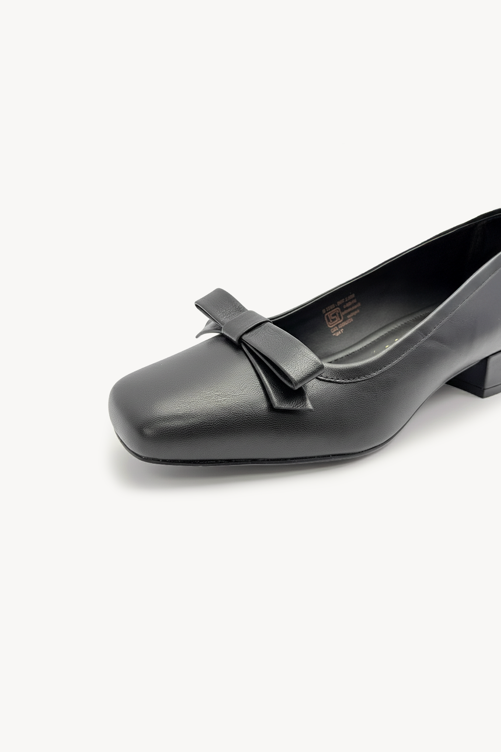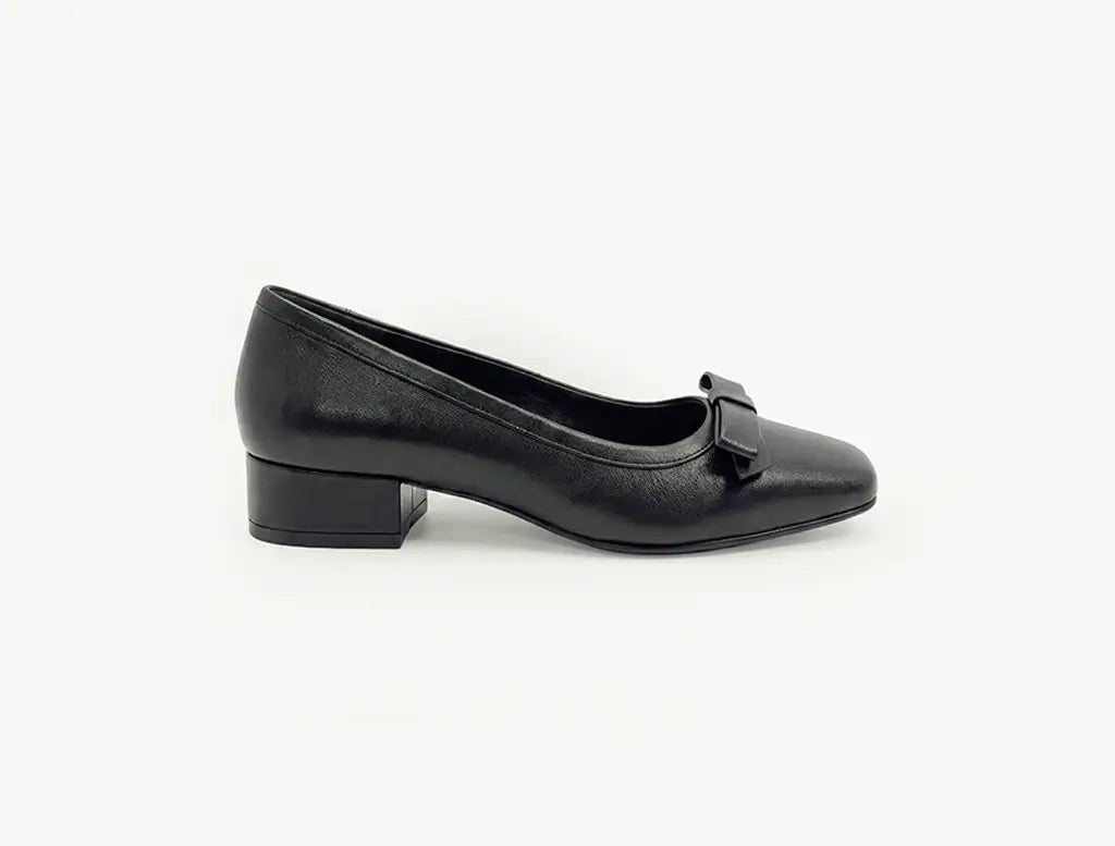 Elegance with a modern twist. This low-heeled pump features a sleek square toe, a structured bow, and a breathable leather lining. A cushioned insole offers all-day comfort, while tonal stitching enhances its refined silhouette. Timeless charm, effortless wear.