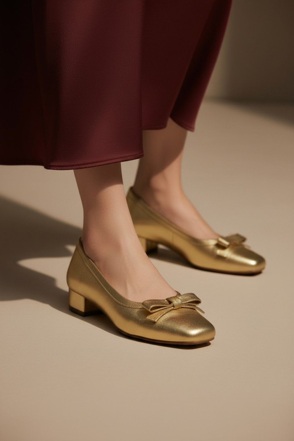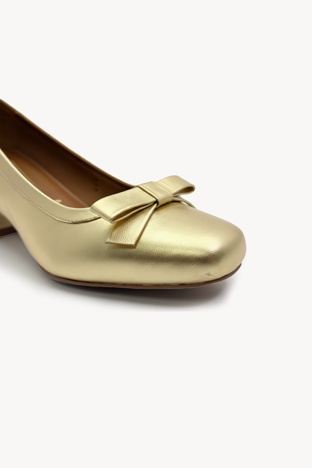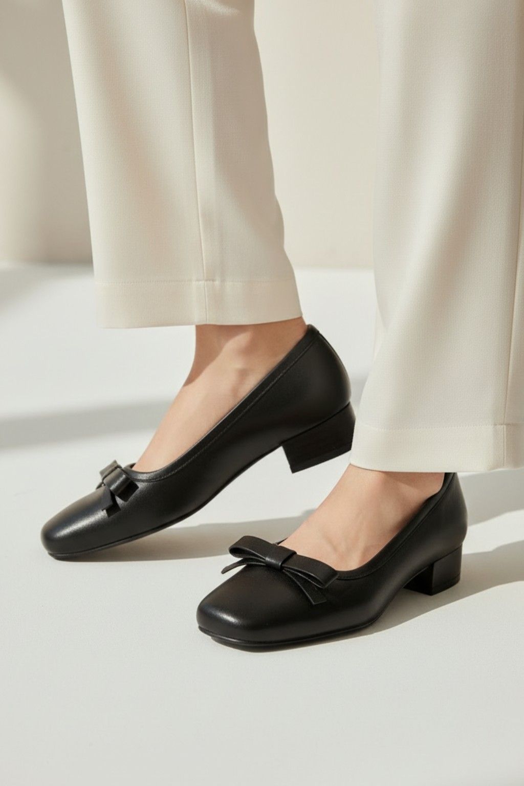 Elegance with a modern twist. This low-heeled pump features a sleek square toe, a structured bow, and a breathable leather lining. A cushioned insole offers all-day comfort, while tonal stitching enhances its refined silhouette. Timeless charm, effortless wear.