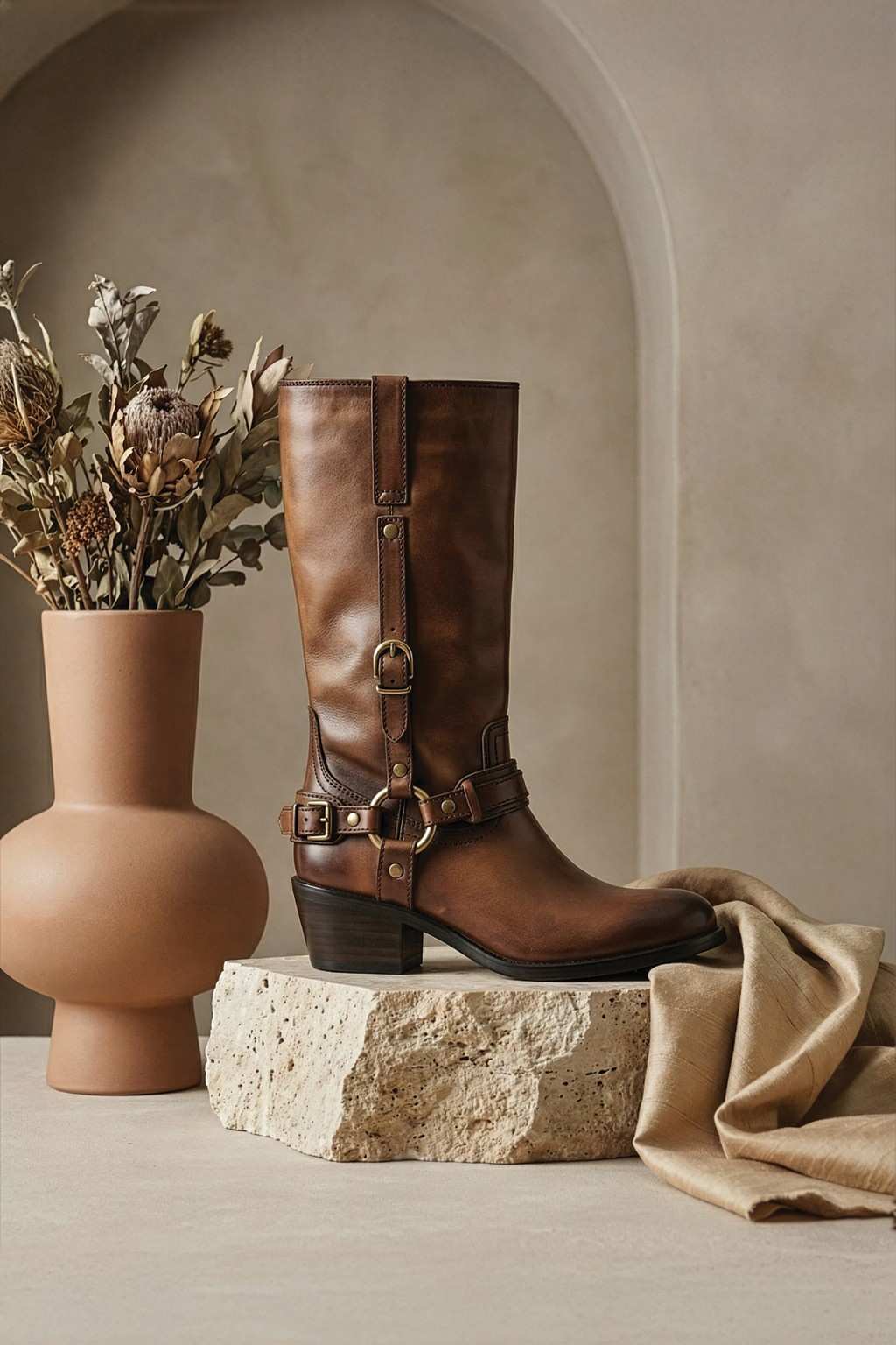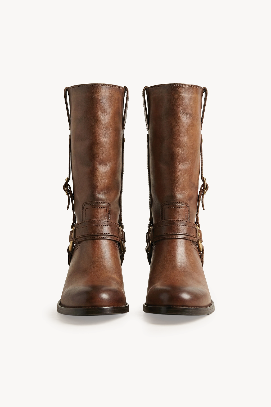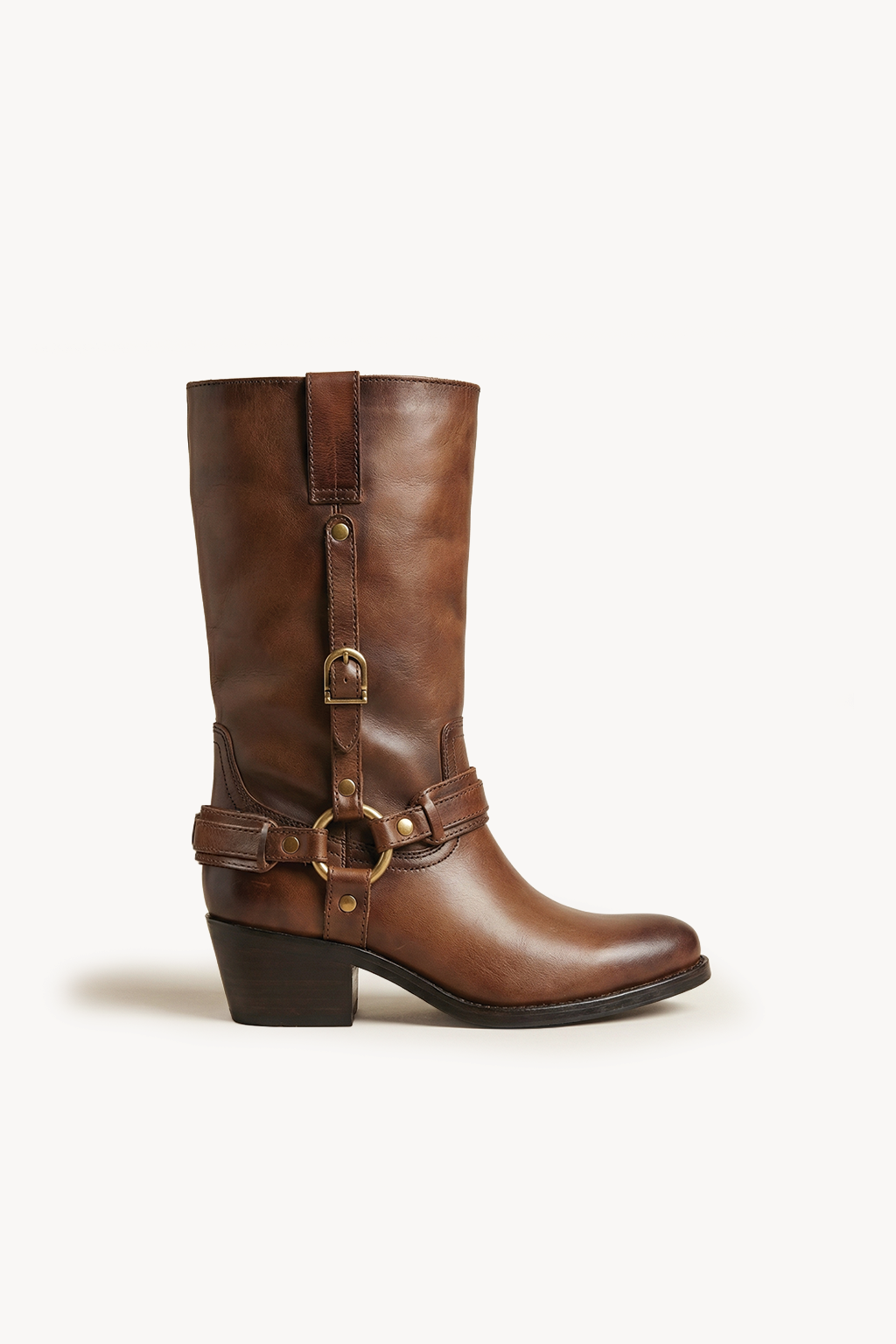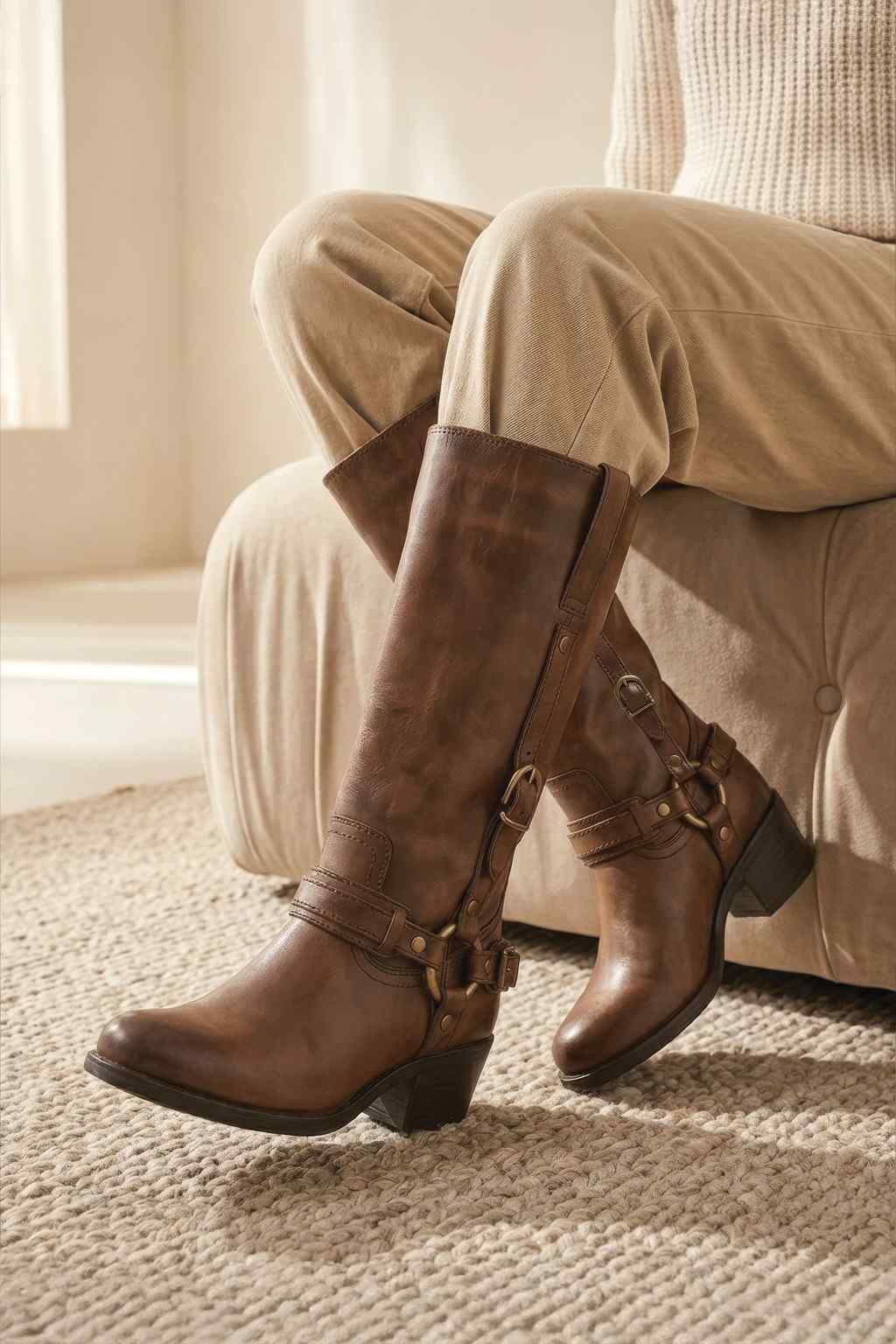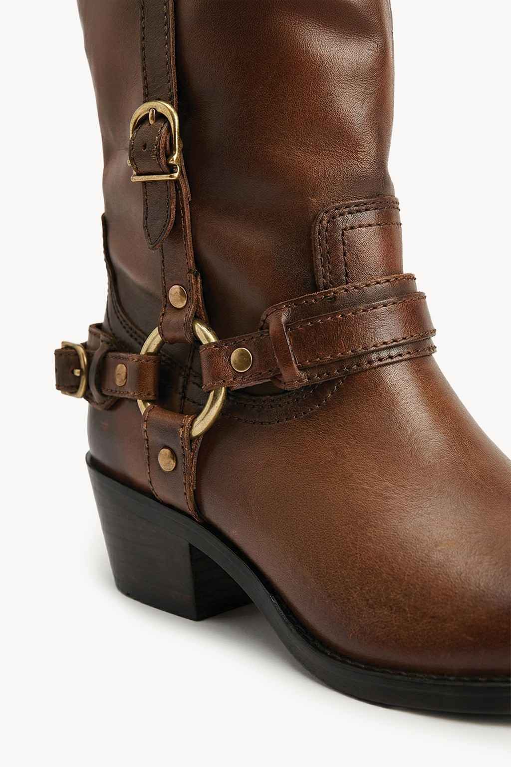 Elevate your everyday look with these leather harness boots, crafted for a perfect balance of style and durability. Featuring premium leather construction with buckle and strap detailing, these boots offer a bold yet timeless appeal. The mid-calf design, pointed toe, and comfortable block heel provide a sleek silhouette with reliable all-day support.