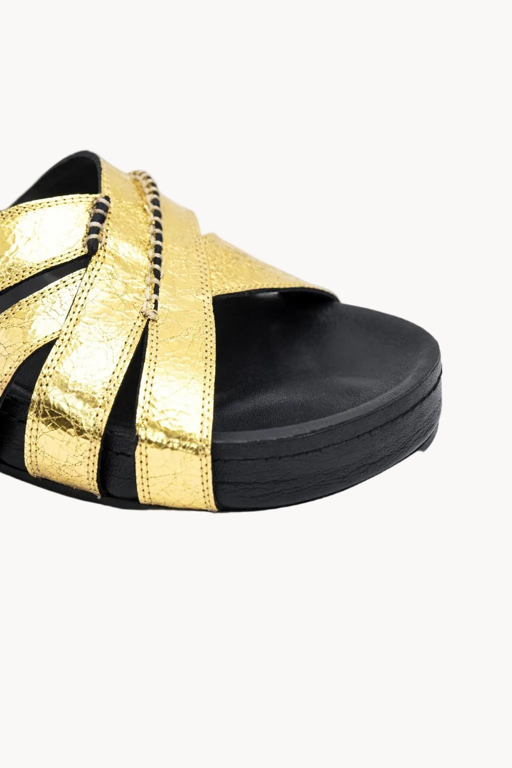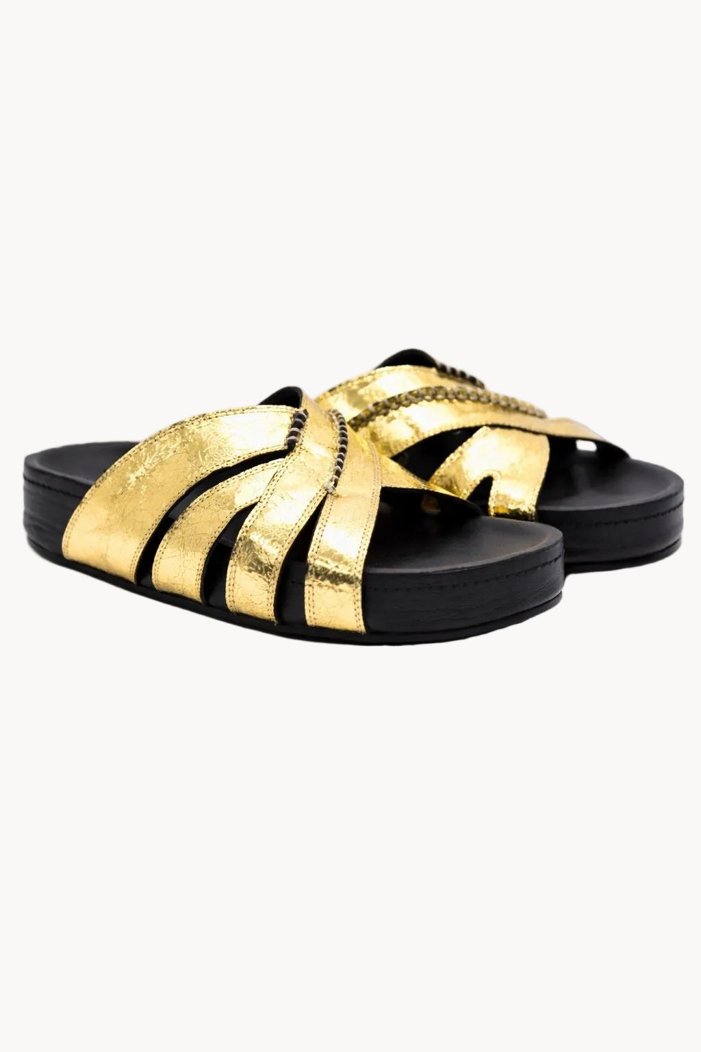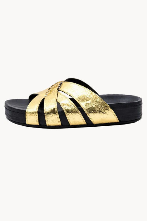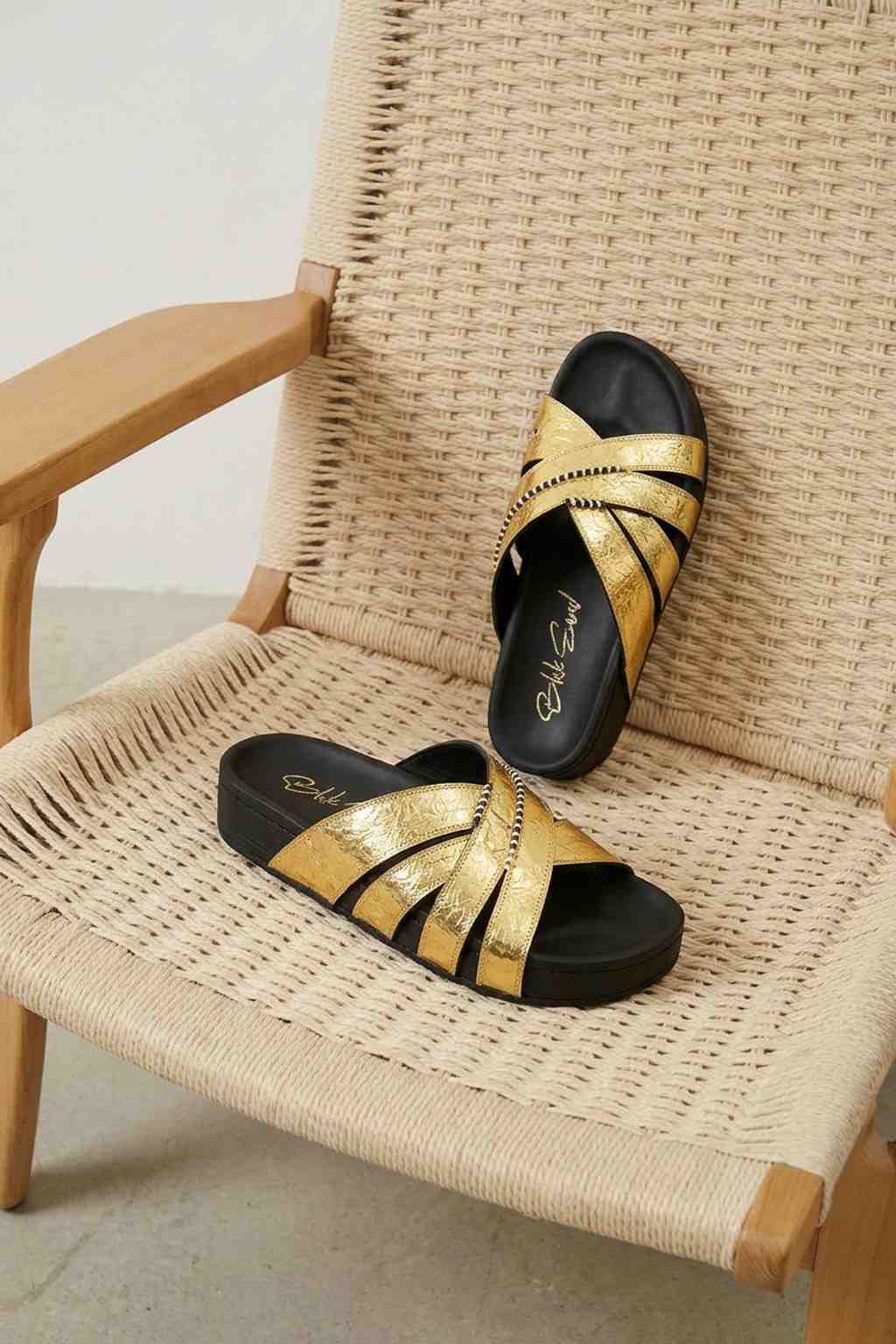Inspired by the opulence of imperial Russian courts, the Romanov Zoloto Slides embody effortless elegance and modern luxury. Crafted in luminous metallic gold leather, the sculptural multi-strap design wraps the foot with refined structure while maintaining a relaxed, slip-on silhouette.