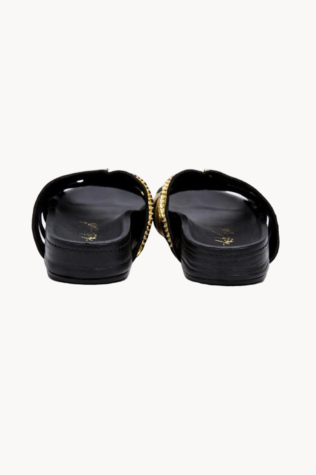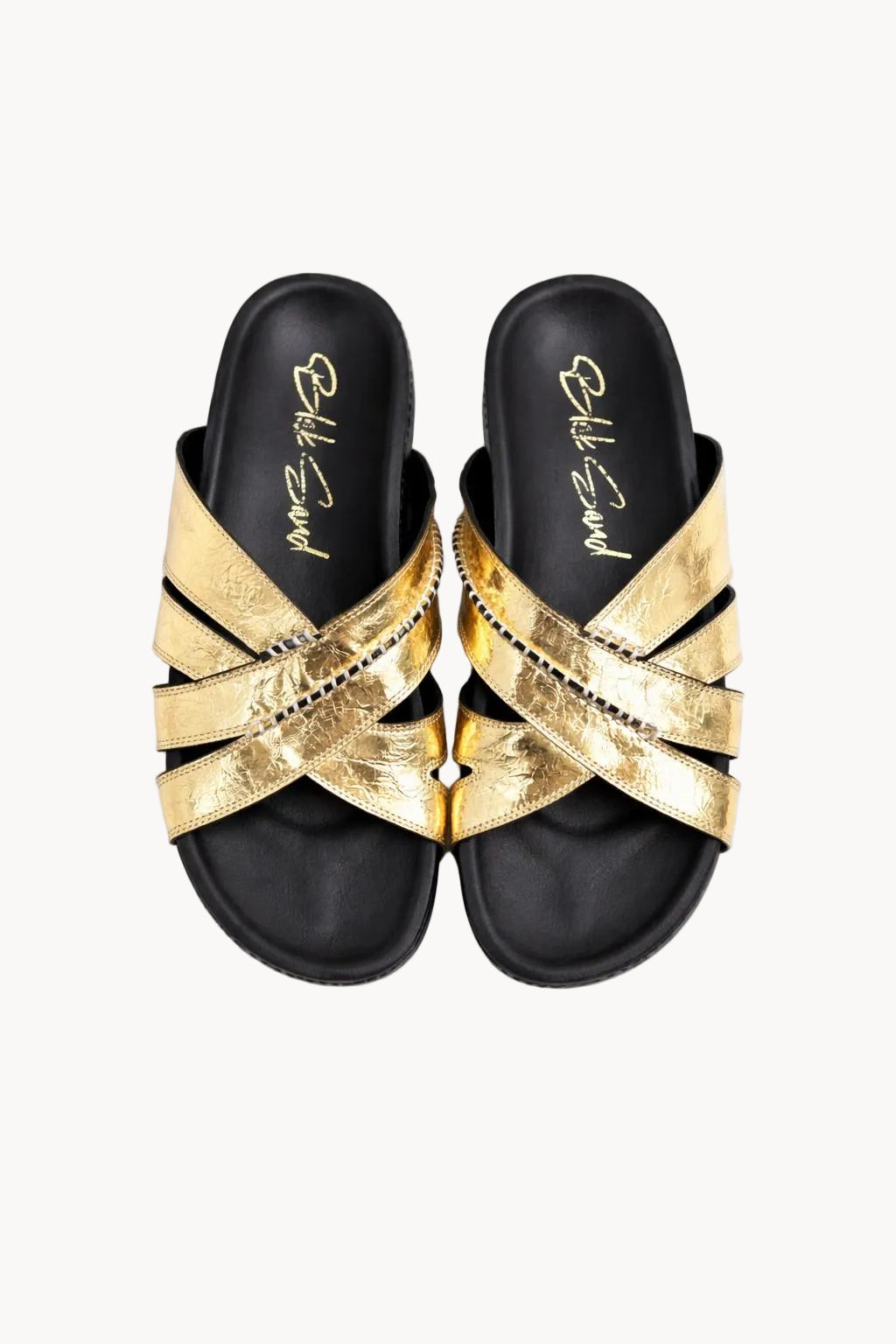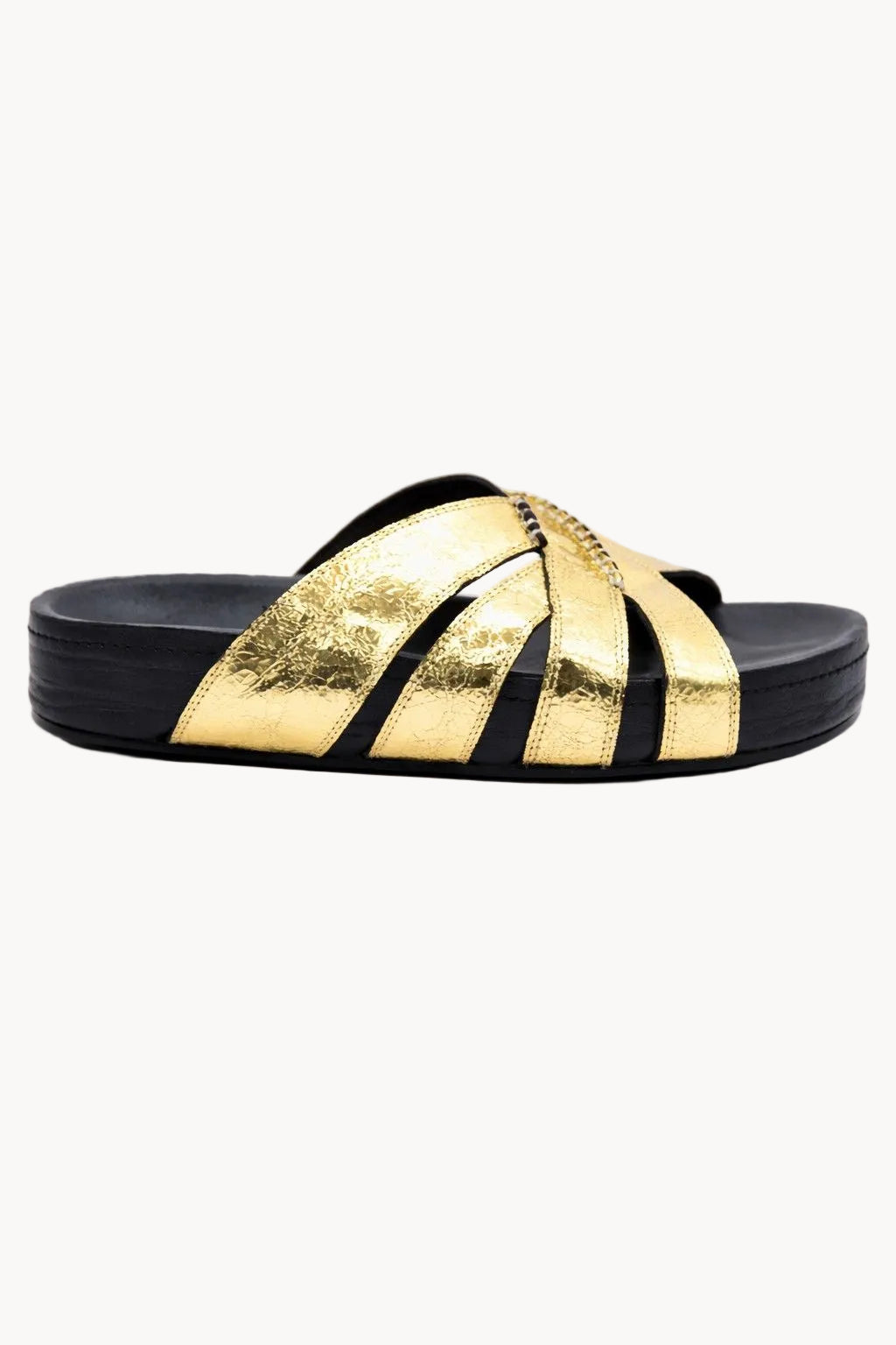 Inspired by the opulence of imperial Russian courts, the Romanov Zoloto Slides embody effortless elegance and modern luxury. Crafted in luminous metallic gold leather, the sculptural multi-strap design wraps the foot with refined structure while maintaining a relaxed, slip-on silhouette.