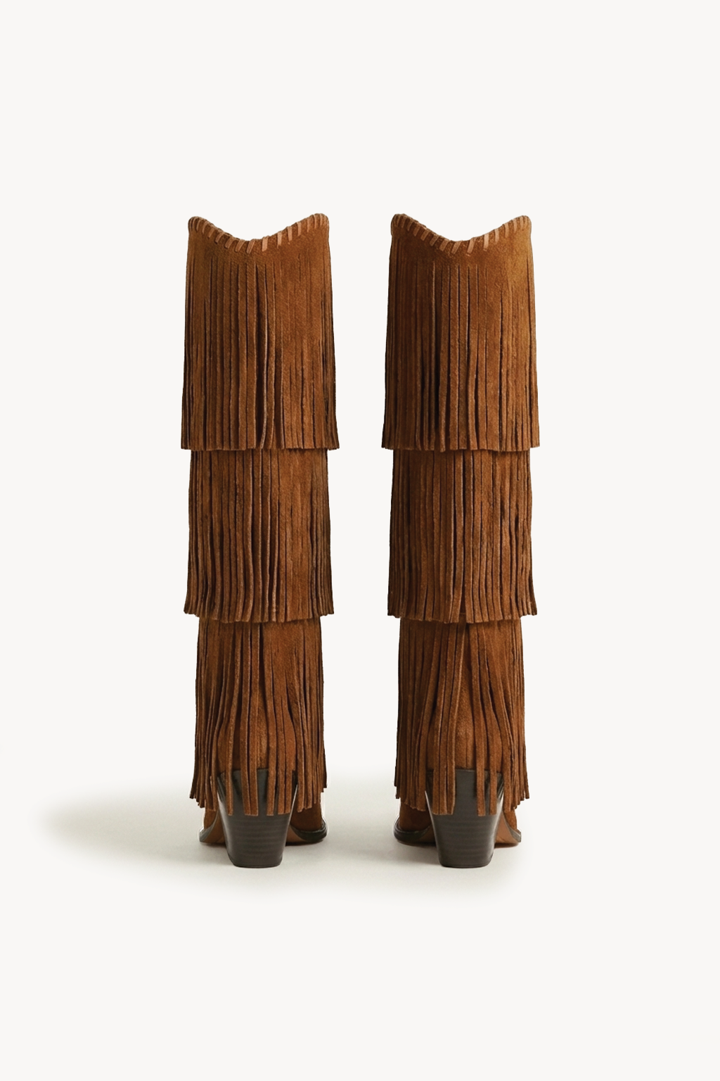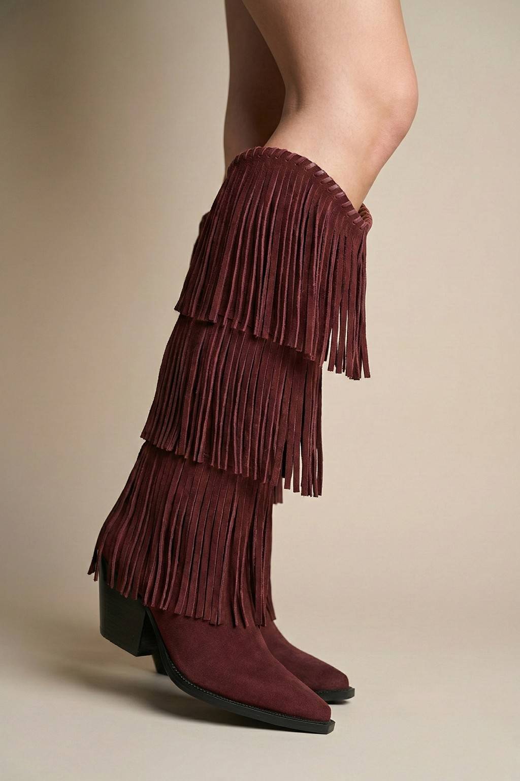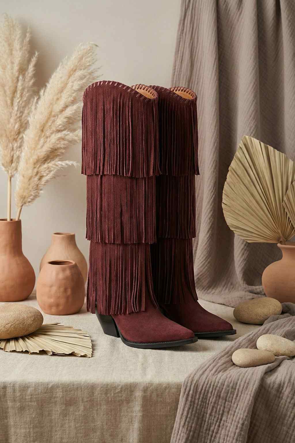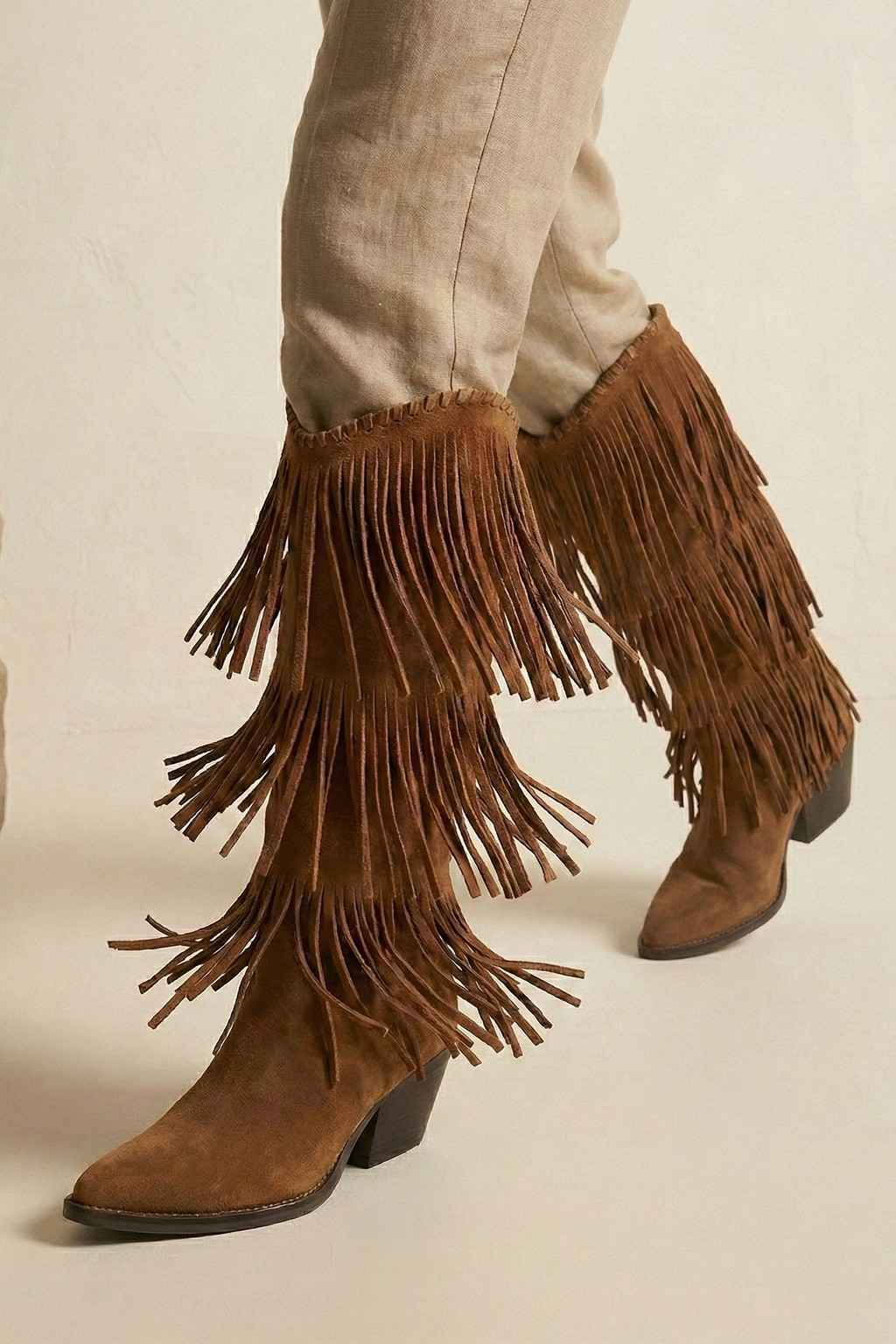 Bold, playful, and timeless, these boots are crafted from premium suede leather. They feature a three-tiered fringe for eye-catching movement and woven detailing for an edgy touch. A cushioned insole, breathable leather lining, and slip-resistant sole ensure all-day comfort and durability. Style meets function, step after step.