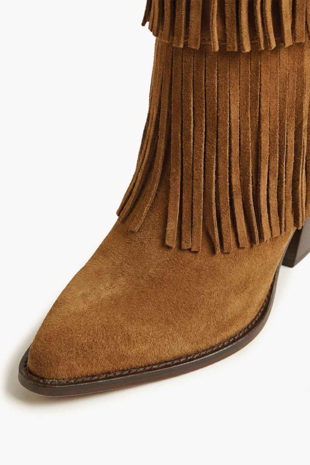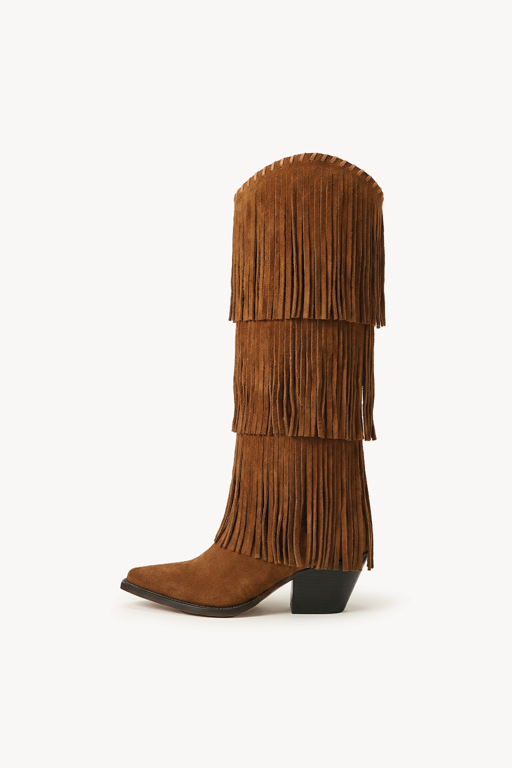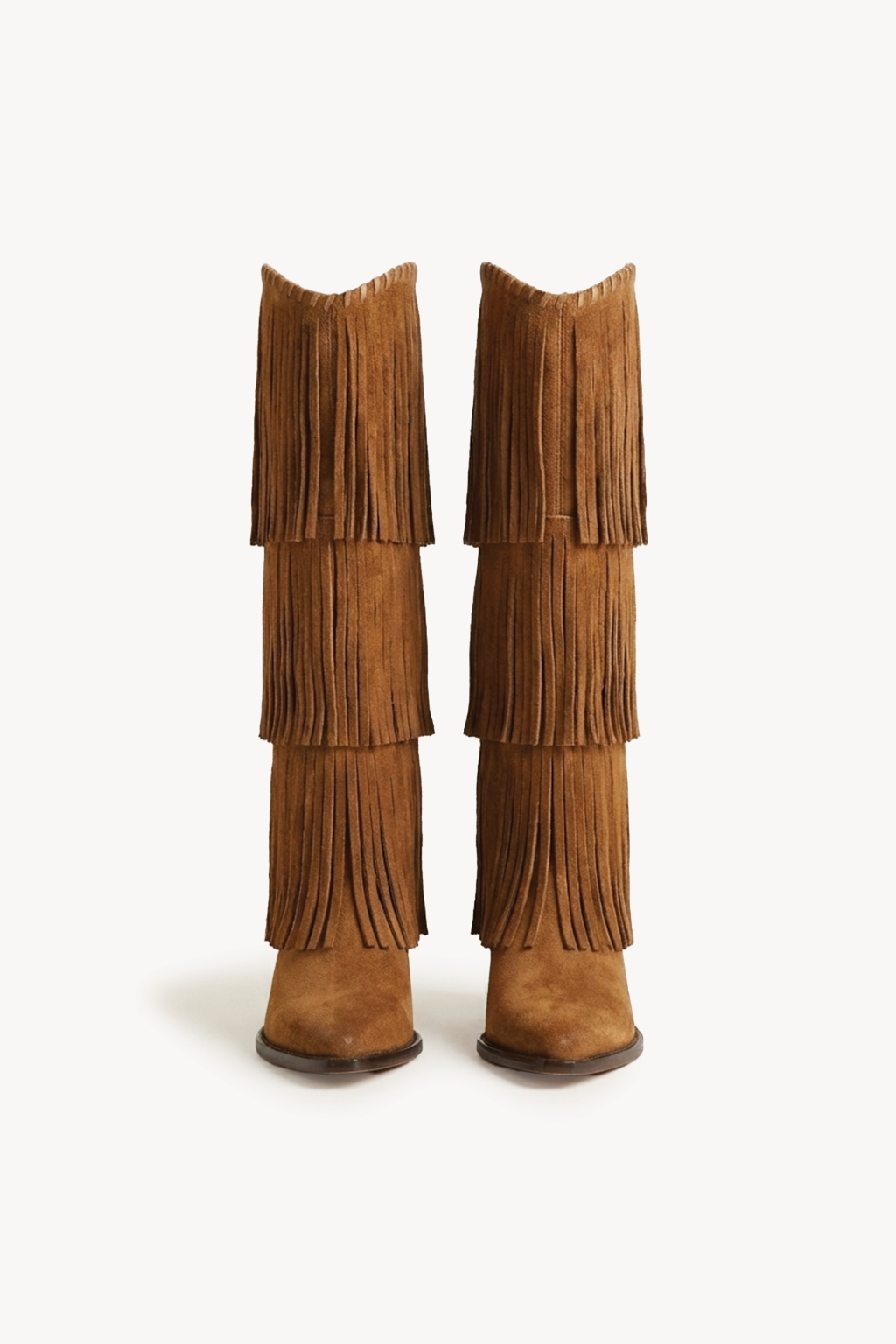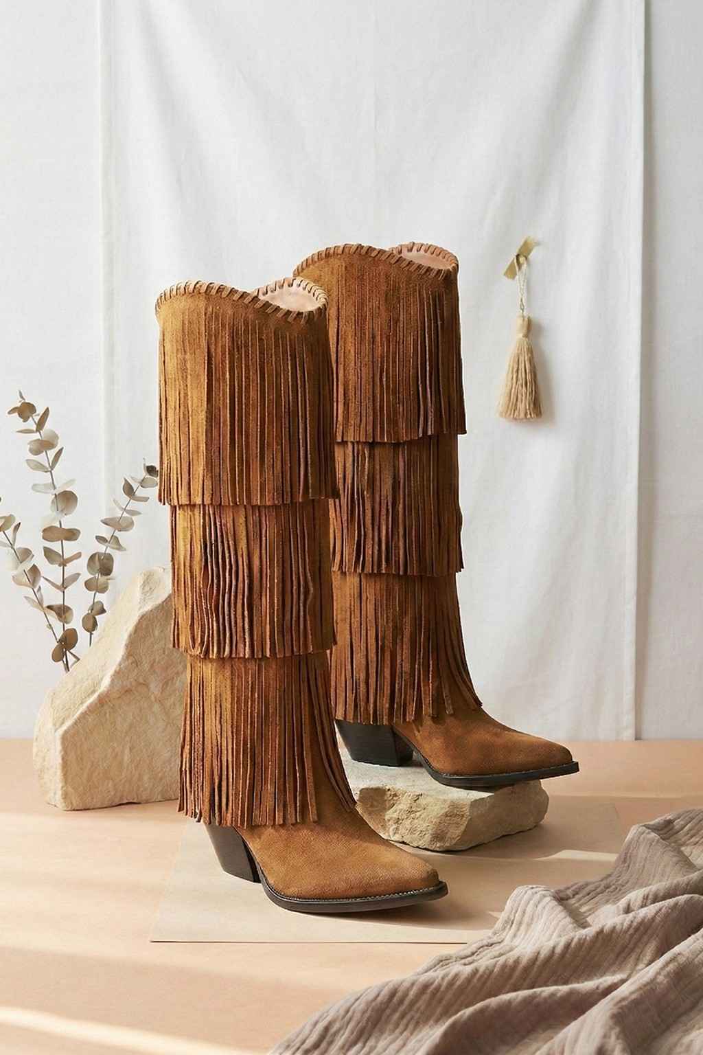 Bold, playful, and timeless, these boots are crafted from premium suede leather. They feature a three-tiered fringe for eye-catching movement and woven detailing for an edgy touch. A cushioned insole, breathable leather lining, and slip-resistant sole ensure all-day comfort and durability. Style meets function, step after step.