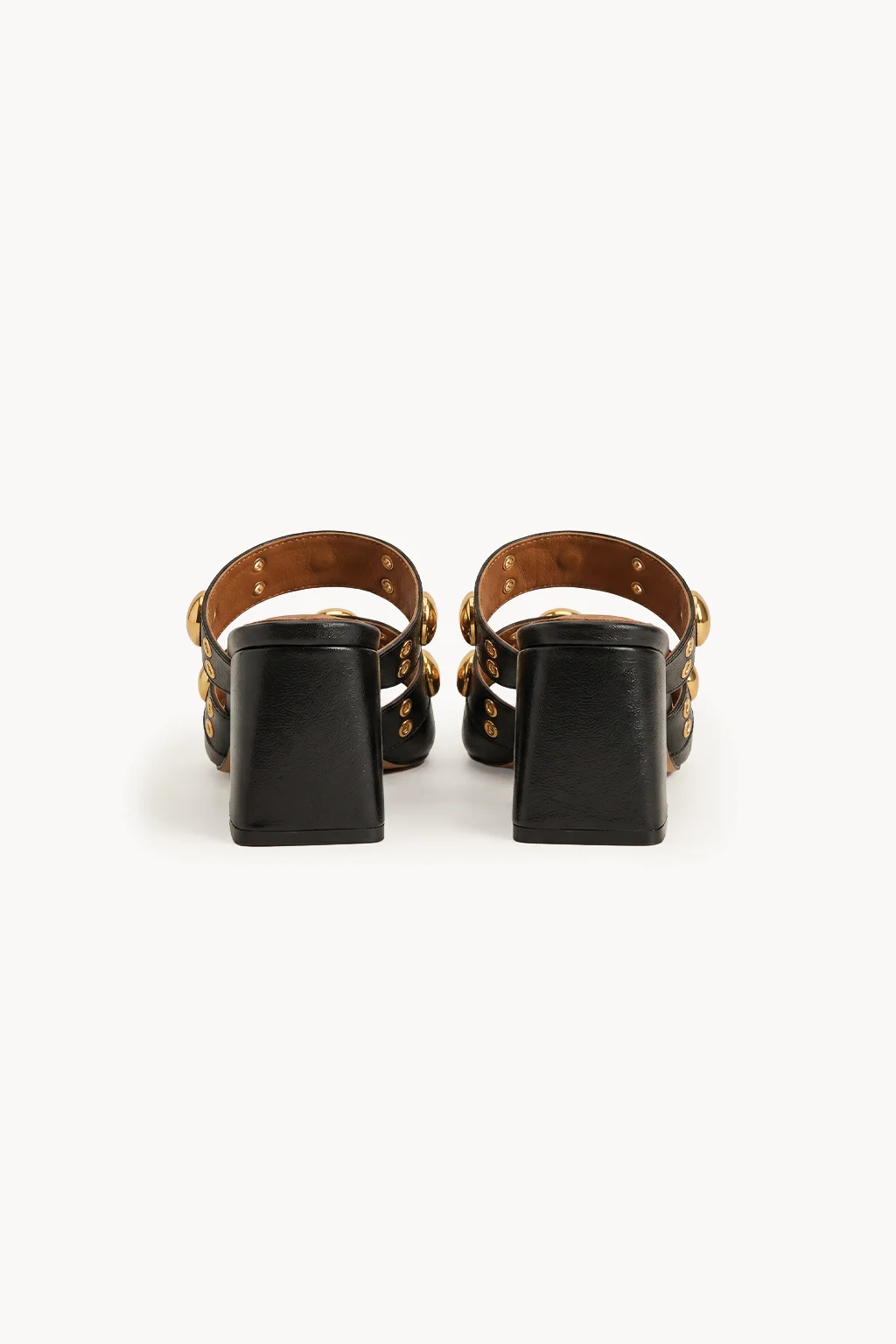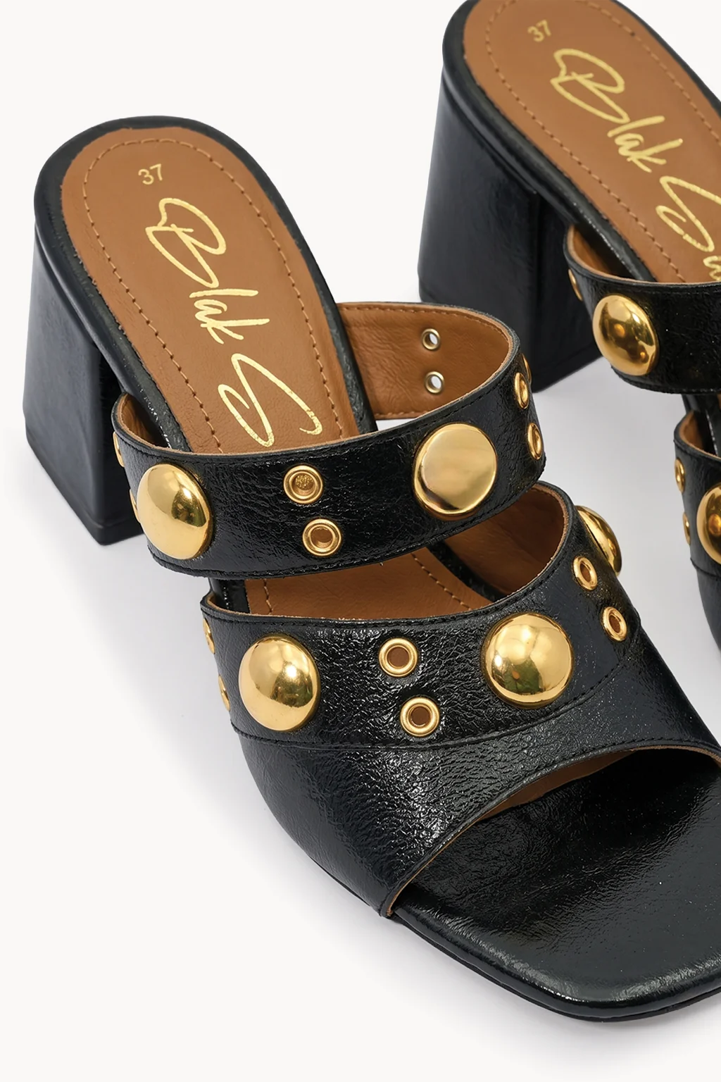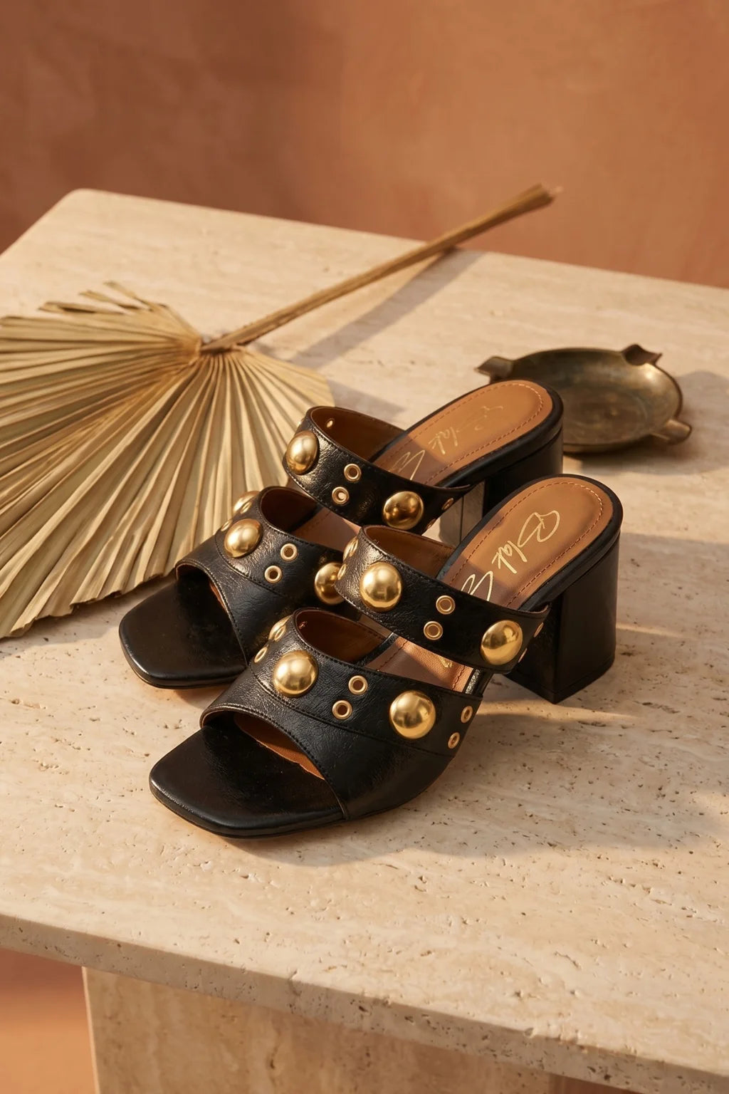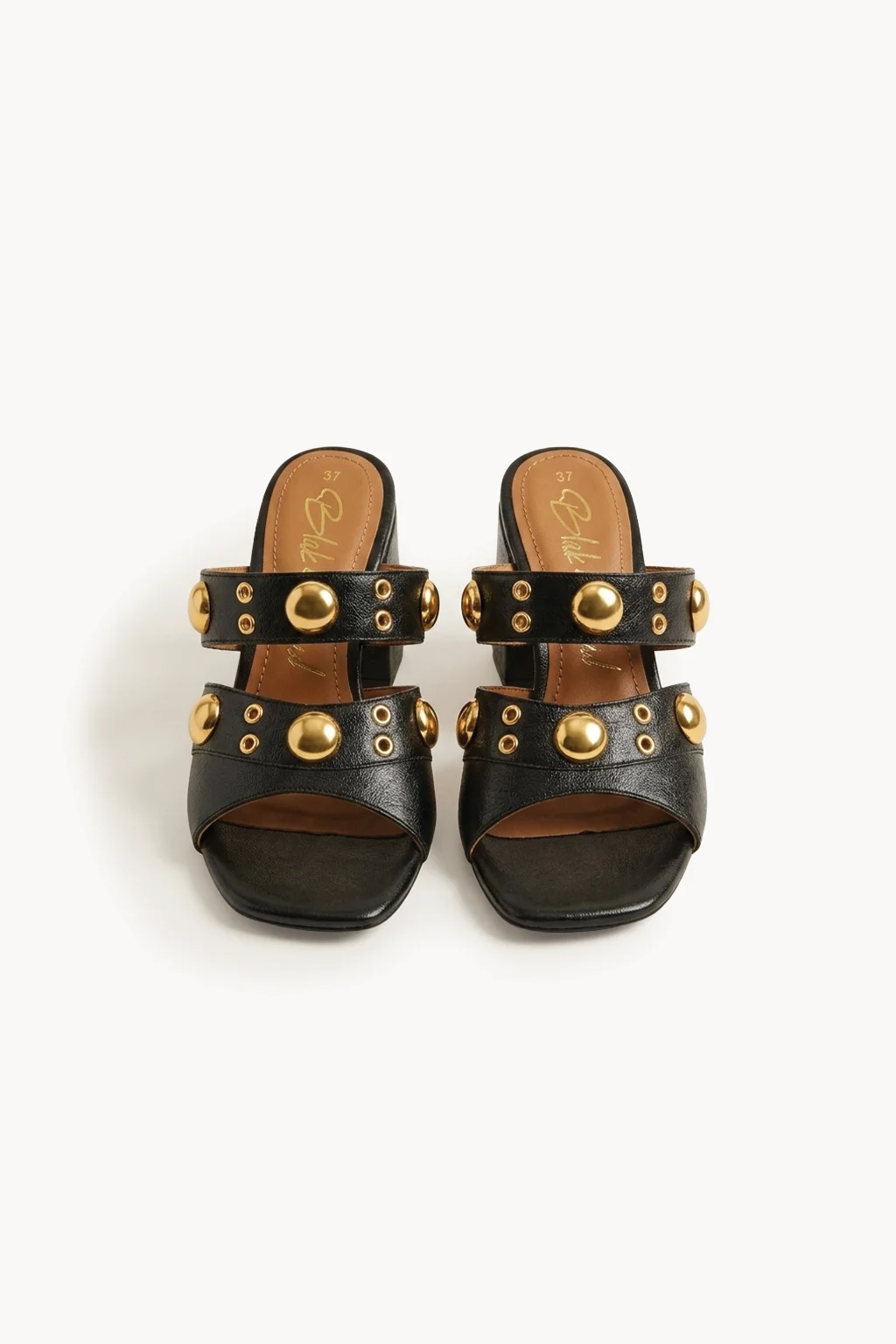 Bold, modern, and unapologetically glamorous—the perfect fusion of Italian edge and luxury craftsmanship. This statement mule is crafted in smooth black leather and adorned with striking gold-tone studs that create a powerful yet refined aesthetic.