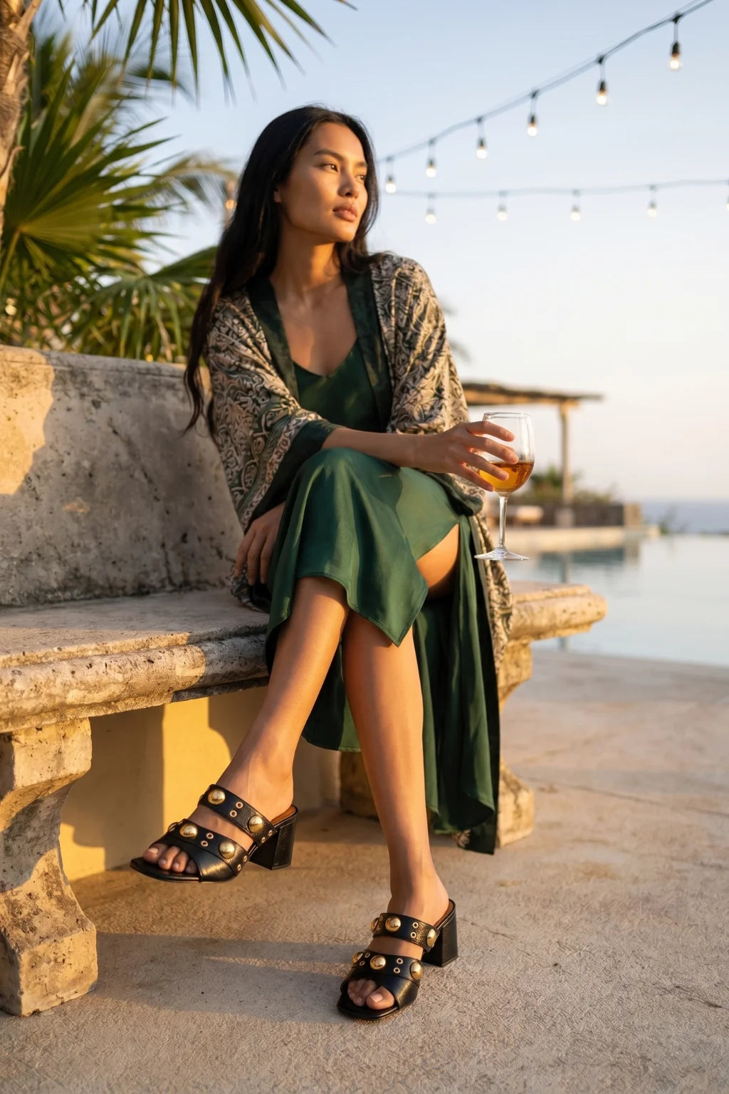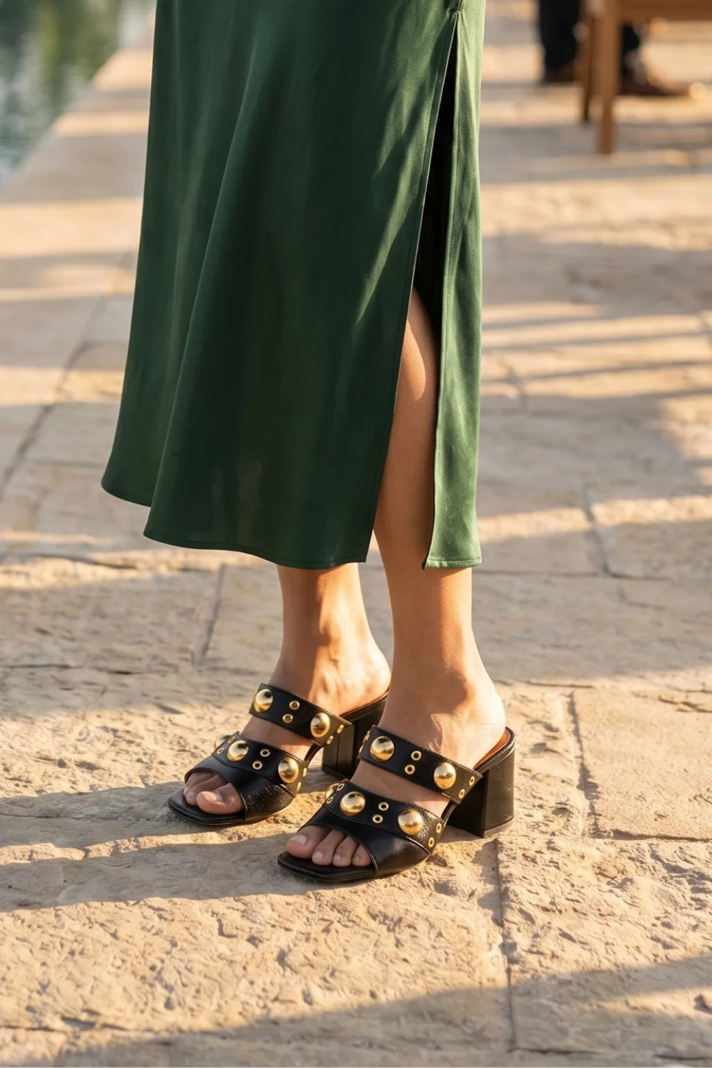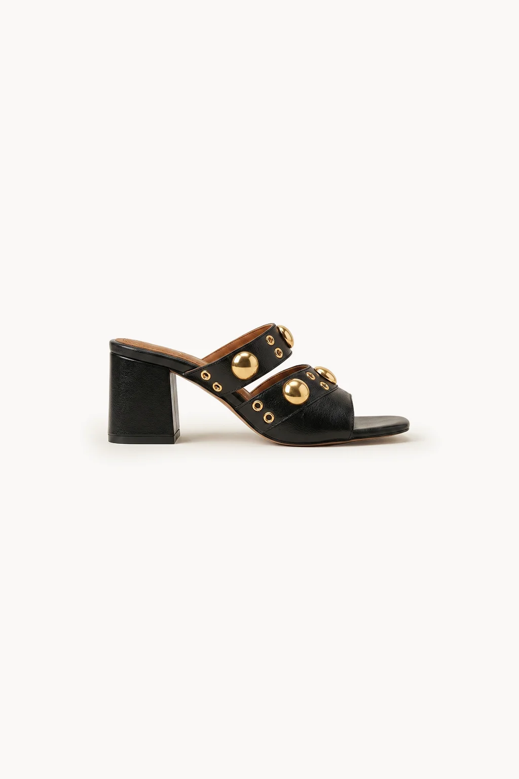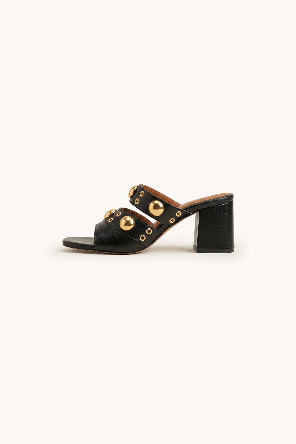 Bold, modern, and unapologetically glamorous—the perfect fusion of Italian edge and luxury craftsmanship. This statement mule is crafted in smooth black leather and adorned with striking gold-tone studs that create a powerful yet refined aesthetic.