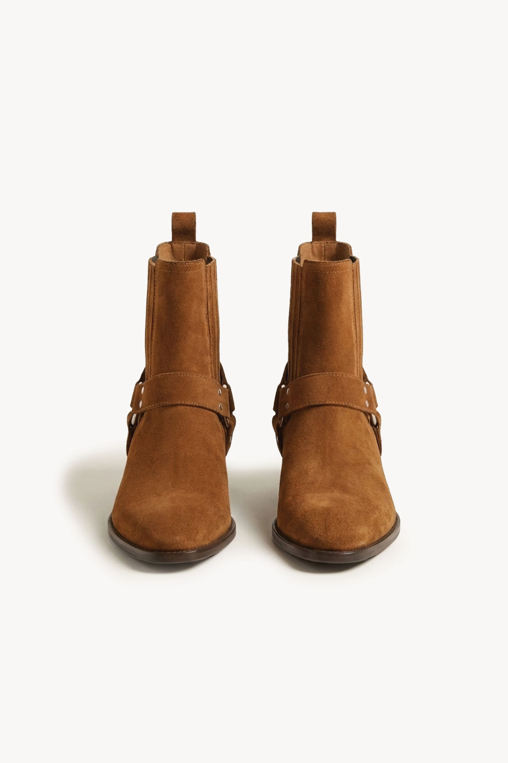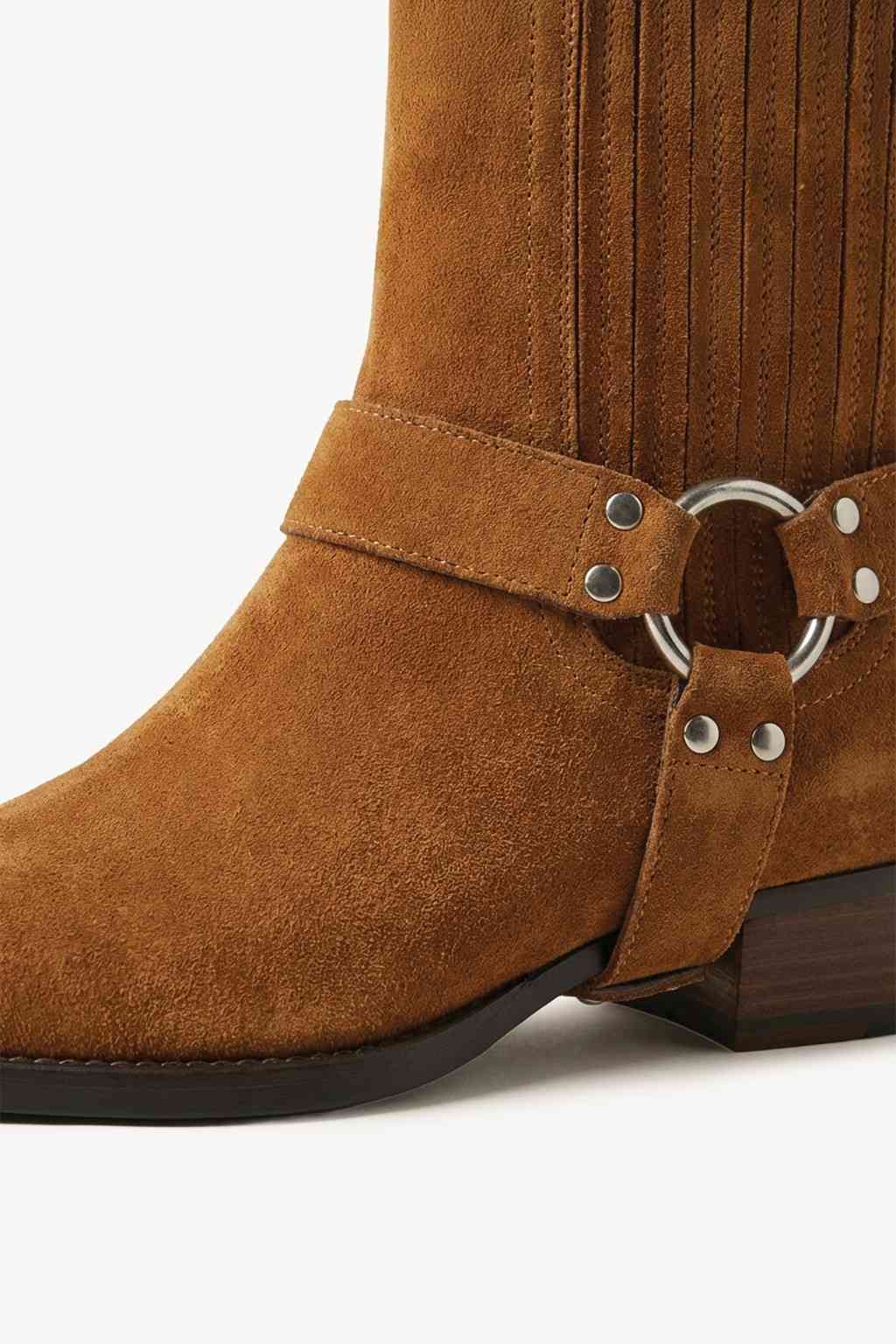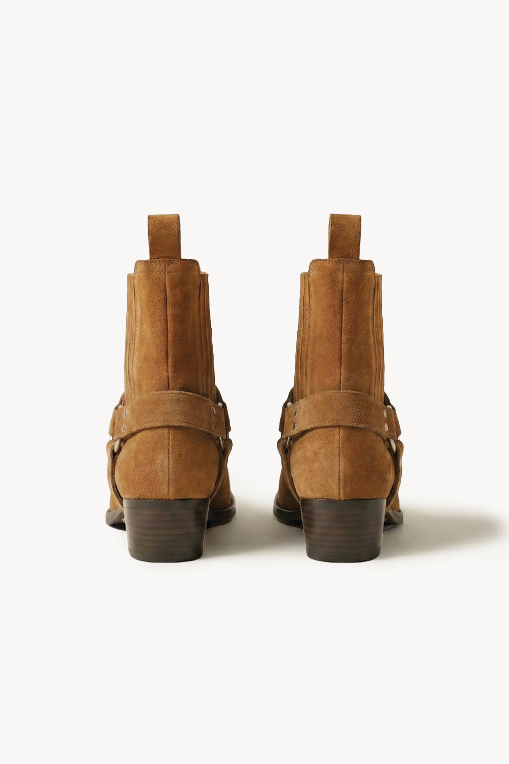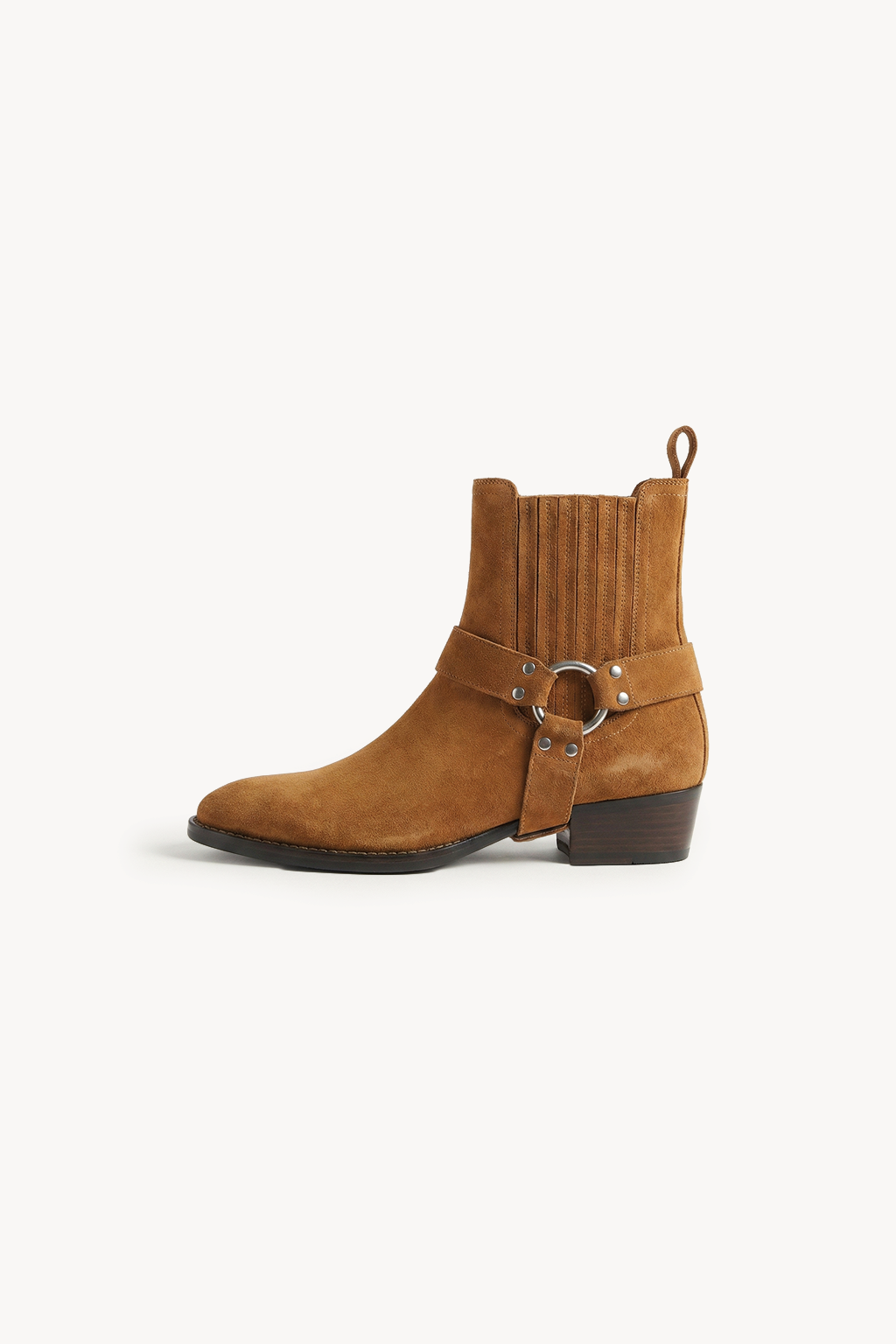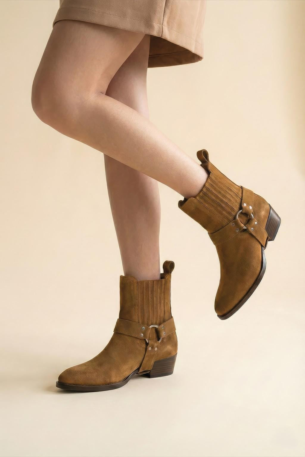 Bold yet refined, Morténe-Luxe Suede Ring Boots bring a modern edge to a timeless western-inspired silhouette. Crafted in velvety suede with polished metal ring hardware and a sculptural harness detail, this sleek ankle boot is finished with a pointed toe and a stable low heel for confident everyday wear. Designed to transition seamlessly from day styling to elevated evening looks, it delivers statement sophistication with understated strength.
